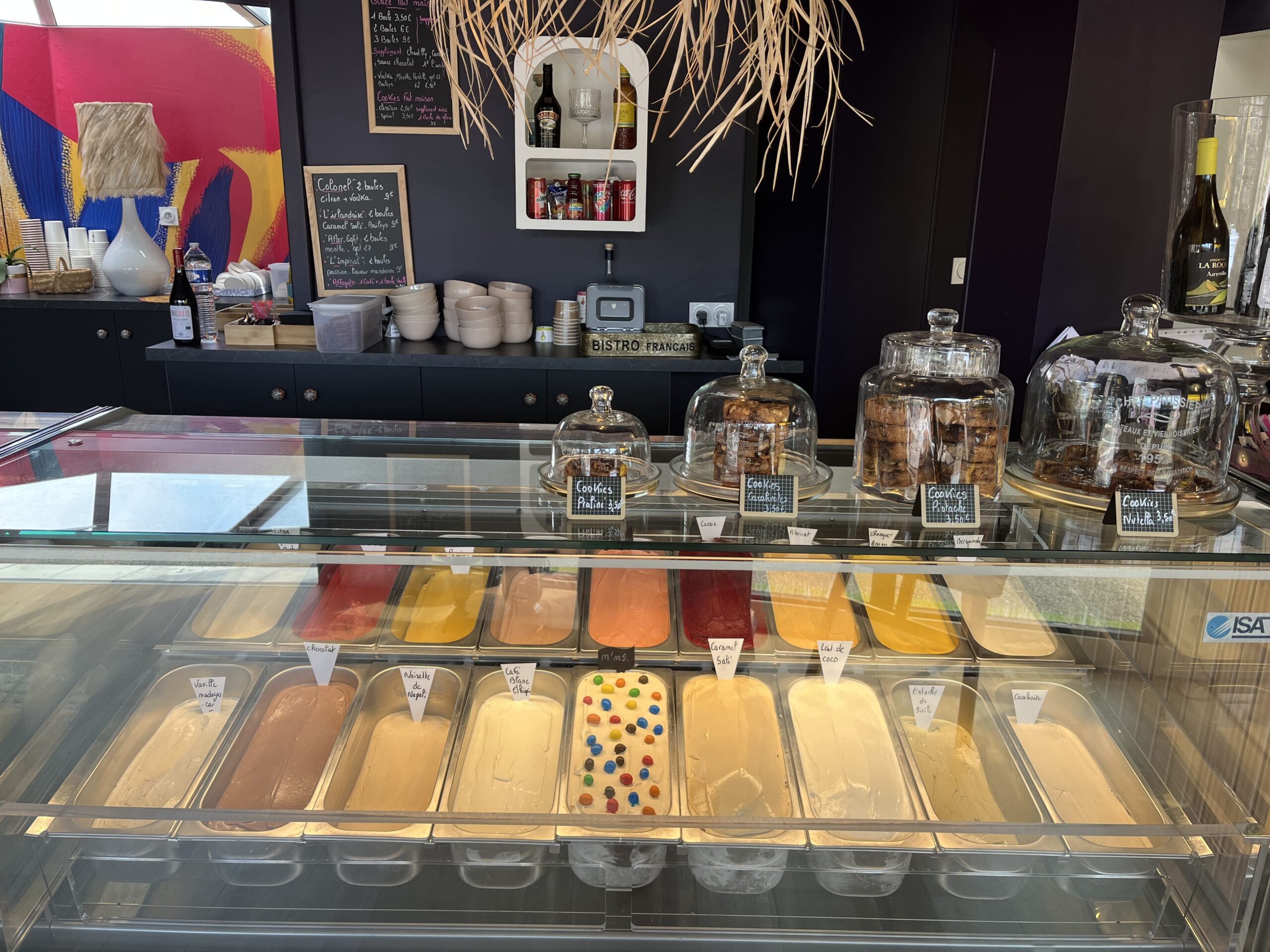 Nous fabriquons notre glace, vous pourrez y déguster des boules mais également des bâtonnets, pralines, profiteroles. Nous vous proposons également des pots de glace ou des gâteaux glacés, mais également des cookies, des petits sablés, des rochers coco à déguster sur place ou à emporter.